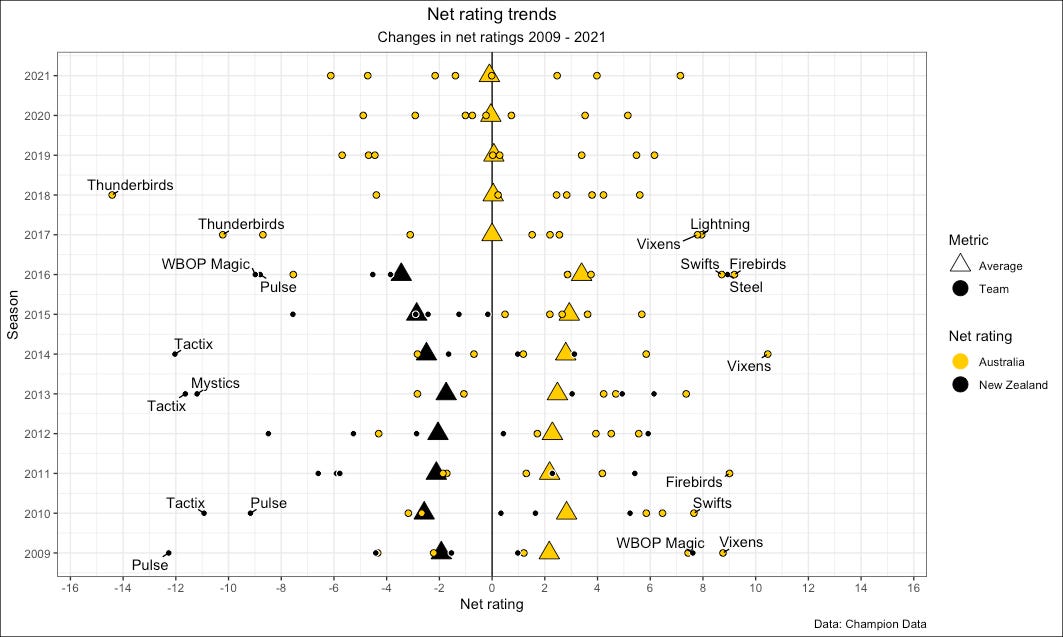 Figure 1 shows the distribution of net rating of all teams from 2009 to 2021. The circles represent a team’s net rating for the season from their country of origin, Australia (gold) and New Zealand (black). The larger triangles represent the average net rating of all teams from their country of origin in a given season. The top and bottom 10 net ratings in the tables above are labelled.