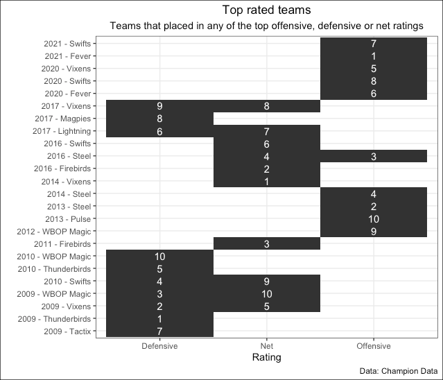 Figure 2 shows the prevalence of good defensive ratings in 2009, 2010, 2017, and good offensive ratings in 2020 and 2021. The top net ratings occurred somewhere in the middle. No team spanned all three top 10’s. The 2016 Steel was the only team to span the top 10 offensive and net rated teams. 5 teams made both the top 10 defensive and net rated teams.
