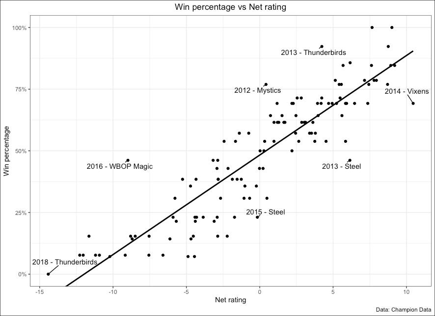 The 2014 Vixens had the best net rating, but managed to win < 75% of their games. The 2012 Mystics had a net rating of just above zero by managed to win just over 75% in the regular season. As was discussed earlier, net rating can be boosted by blow-out wins and close losses. What could also be said is, given the Vixen’s rating, they were unlucky not to win more games.