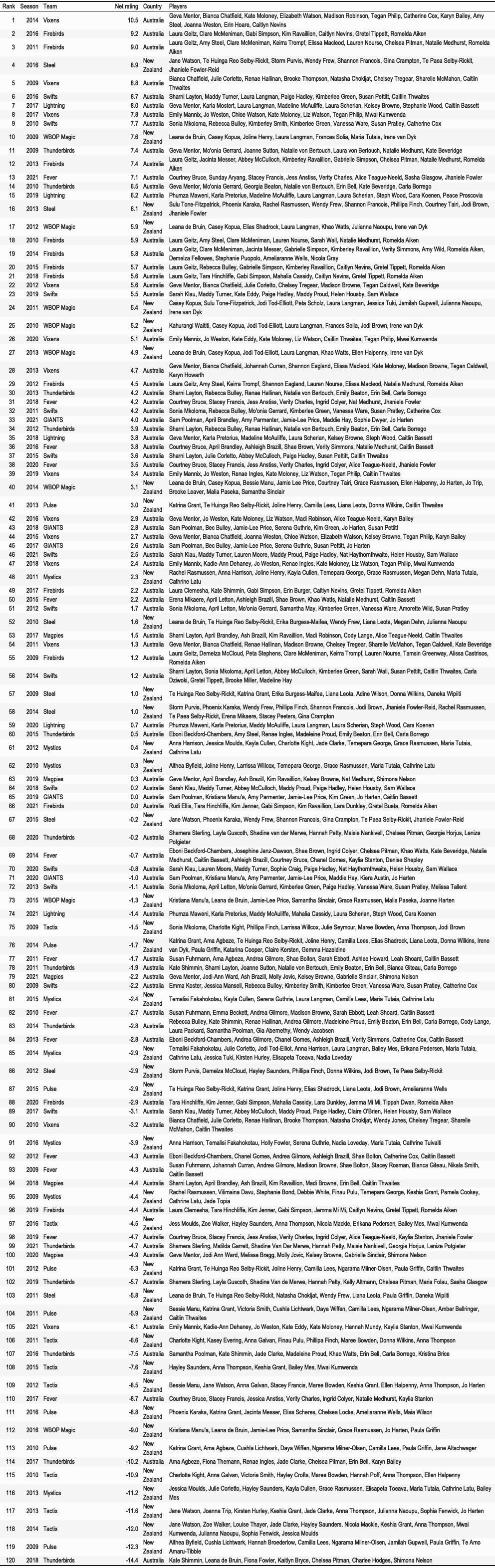 The 2018 Thunderbirds had the lowest net rating, with -14.4. They lost all of their matches for the season, the only team to have a win-less season in all the seasons analysed.