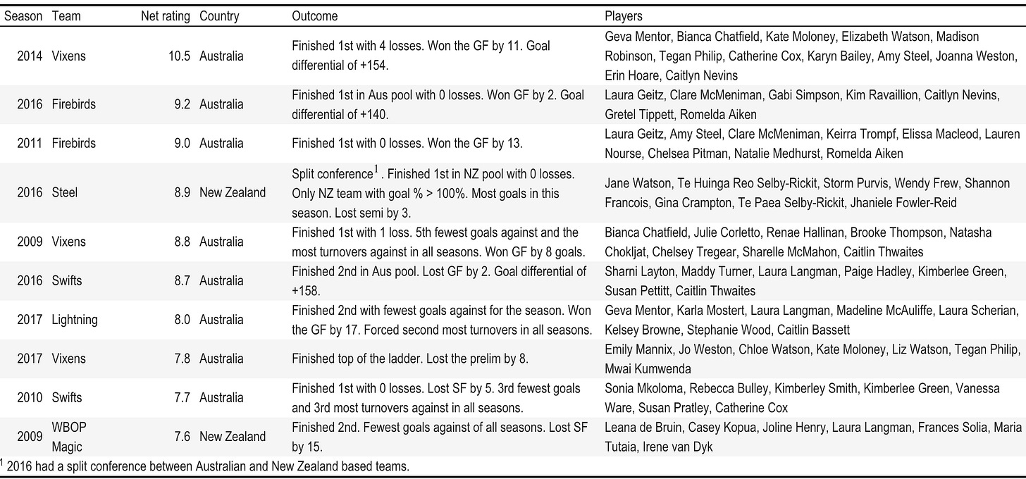 The 2014 Vixens had the best net rating of all teams and finished the season with a record of 9 wins, 4 losses. Their wins were emphatic, by an average of 18 goals. Their biggest win came in round 8 against the Thunderbirds 64 - 26. Their largest loss was to the WBOP Magic in round 44-49. So their wins were big, and the losses were small, which lead to their strong net rating. They won the grand final that year against the Firebirds 53 - 42. The vast majority of their players also played at an international level at some point in their career.